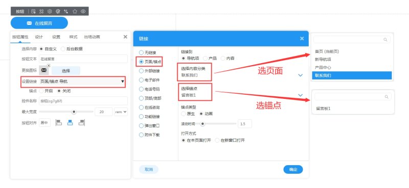 2,在按钮属性里,点击设置链接,链接类型选择“页面/锚点”,然后选择指定的页面和开启的锚点。可以选择跳转跳到的类型是原生(直接跳到)还是动画(滚动)。