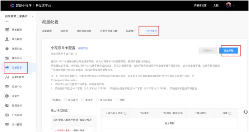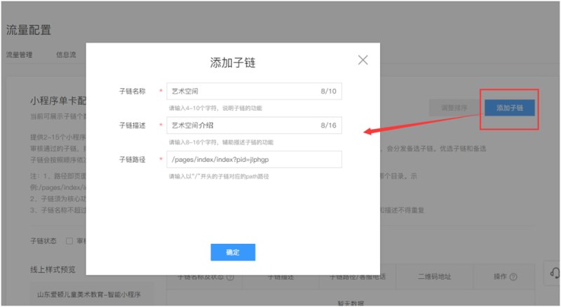 1,小程序上线后,在小程序官网,流量配置里,点击小程序单卡-添加子链。