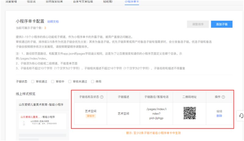 3,添加后在页面上会有显示,等待百度审核即可,审核时间是2-5个工作日。注意:至少添加2条子链,才能在小程序单卡中生效。