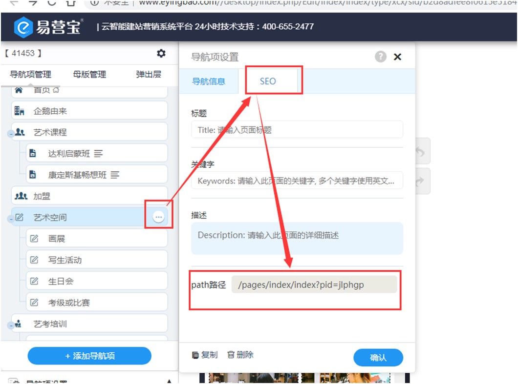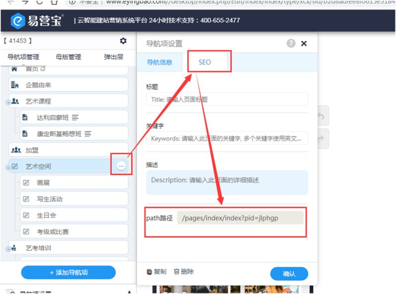 4,路径的获取方法:进入易营宝后台小程序编辑页面,在页面设置-SEO里可获取到path路径,就是子链路径。
