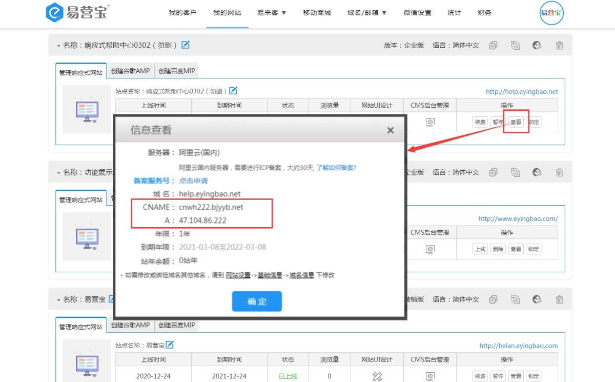 4,在易营宝后台项目列表里,点击查看按钮,在网站信息弹窗里,可以看到该网站上线的服务的解析记录值。A记录和cname选一个就可以。