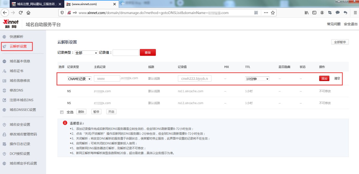 3,在左侧菜单里点击云解析设置,依次填写。填写完成后,点击添加。