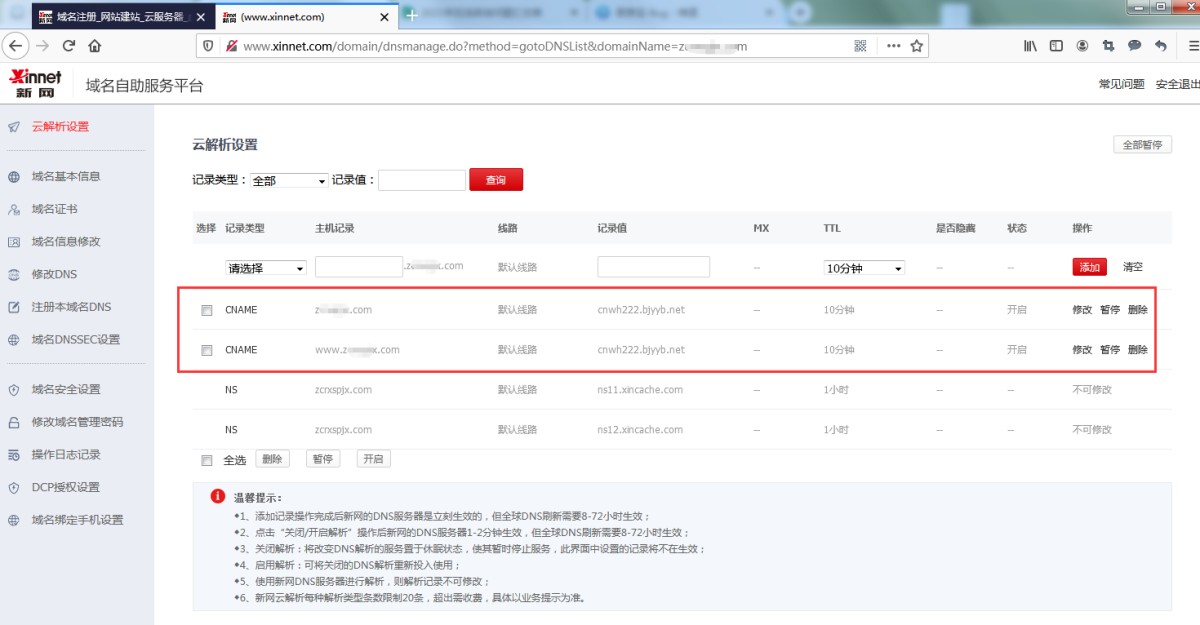 5,域名解析添加完成后,在云解析设置页面会有显示,一般10分钟左右生效,新域名的解析生效时间会长一些,但是一般不会超过24小时。