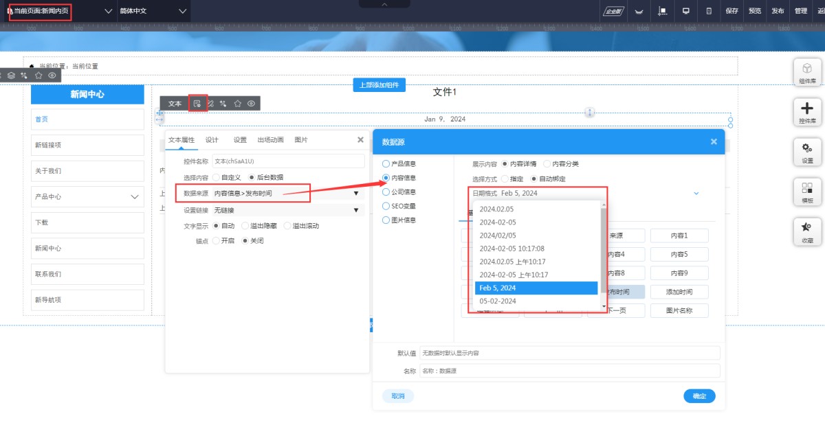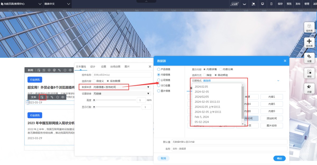 新闻列表是在第一个新闻的日期文本上可以点出属性,数据来源选择自动绑定-发布时间或添加时间,就可以选择日期格式了。