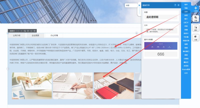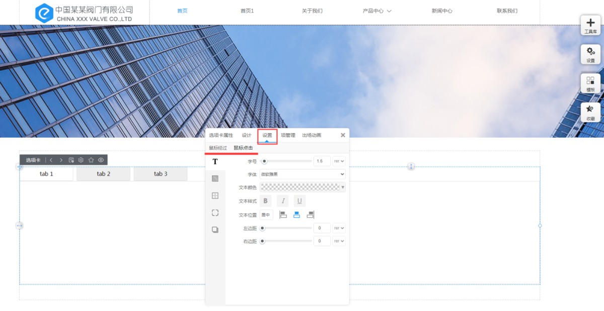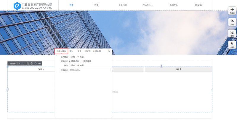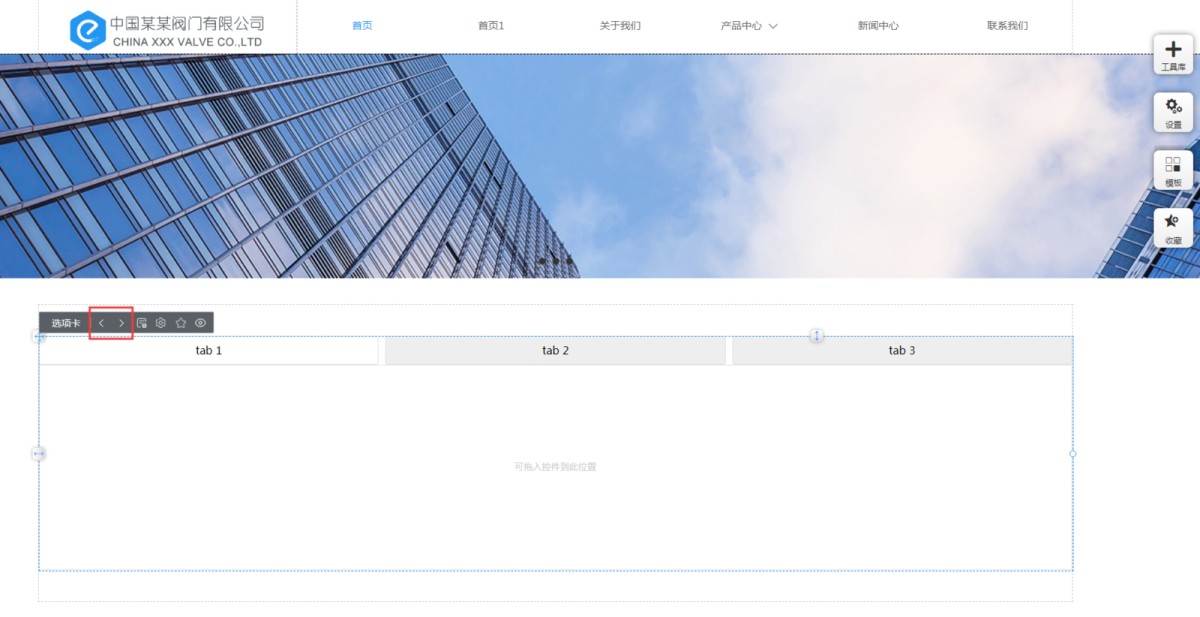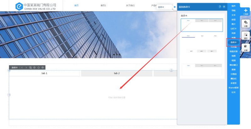 1,在工具库里,点击选项卡,选择合适的样式,添加到页面上。