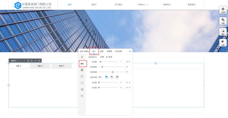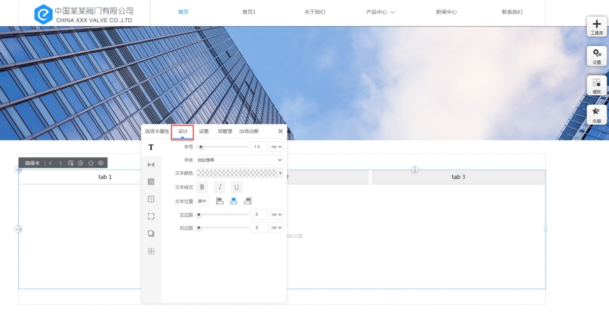 4,在“设计”里,可以修改选项卡标签文本的样式、标签间距、选项卡的背景、边框、圆角、阴影、定位。