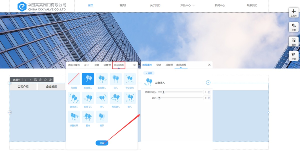 10,在“出场动画”里,我们提供12种动画效果,并且可以设置动画的持续时间和延迟时间。