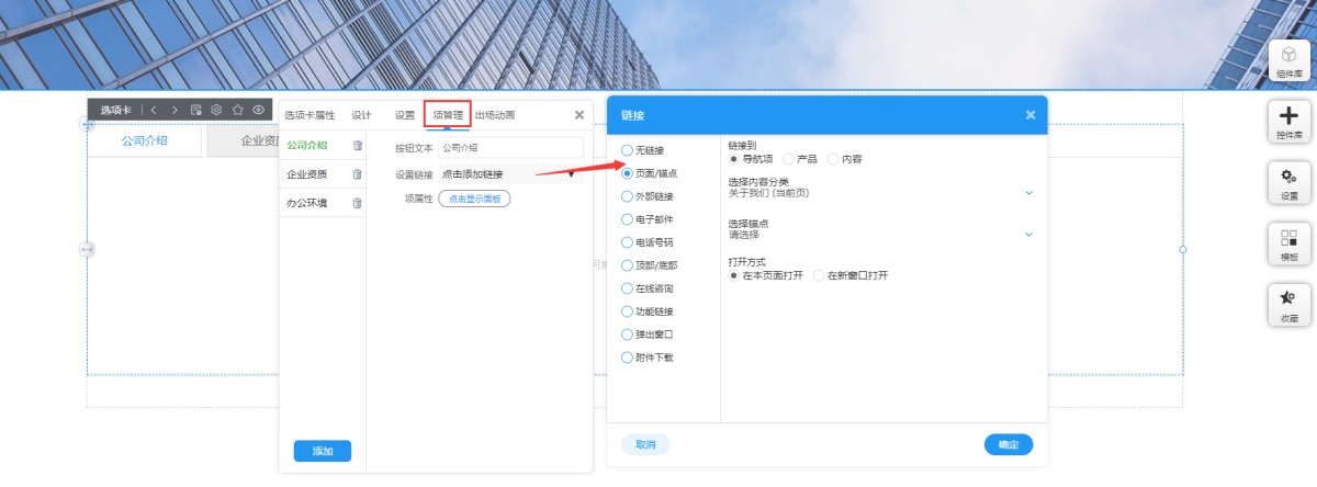 7,在“项管理”里,可以添加和删除标签项,可以拖拽调整标签项的排序,编辑标签按钮的文本,并且可以为标签按钮设置连接。