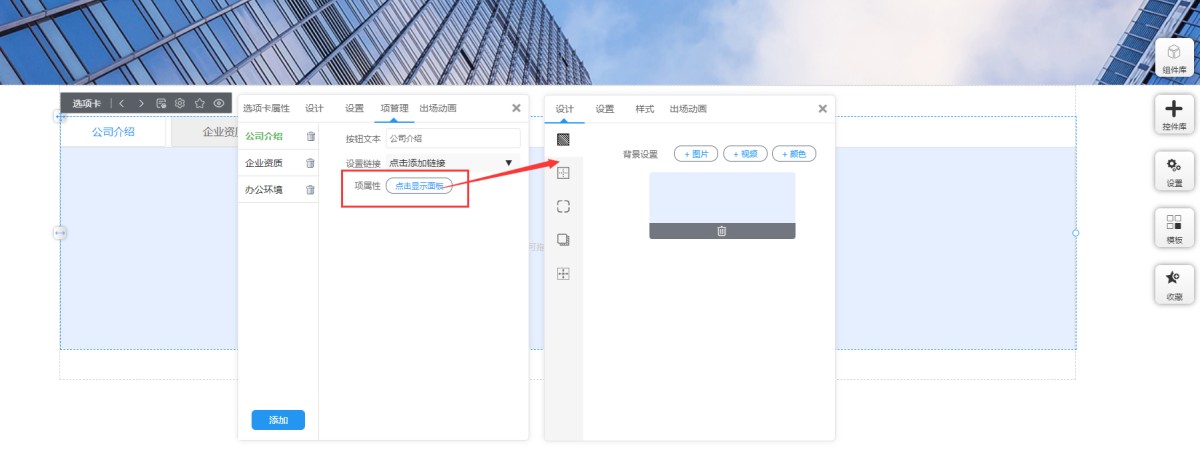 9,在项管理里,点击项属性,可以设置每一项里的背景色或背景图,以及边框、圆角、阴影和定位。