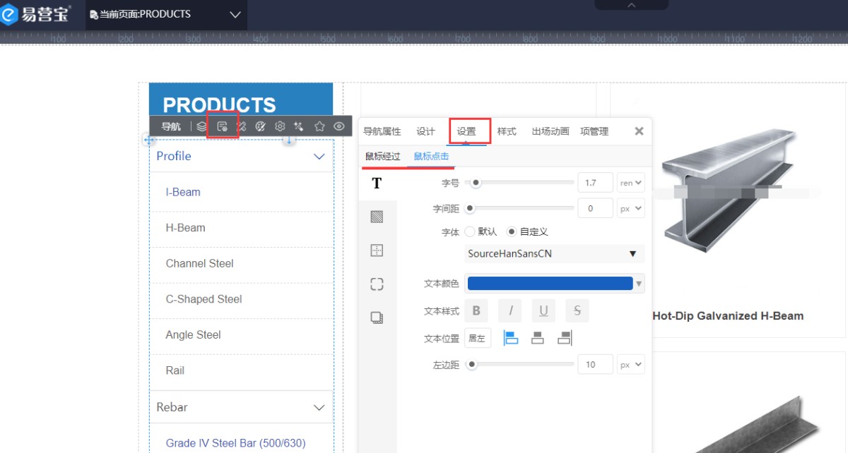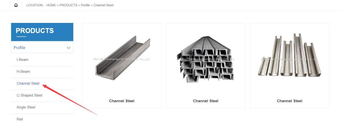 1,我们在产品中心页面点击分类导航时,被点击的分类一般会显示出差异的颜色来注明选中状态,如下图,点击Channel Steel后,文本会变成蓝色。如果没变色,一般是以下两种情况:一,没设置鼠标经过和点击的样式;二,没有绑定分类。