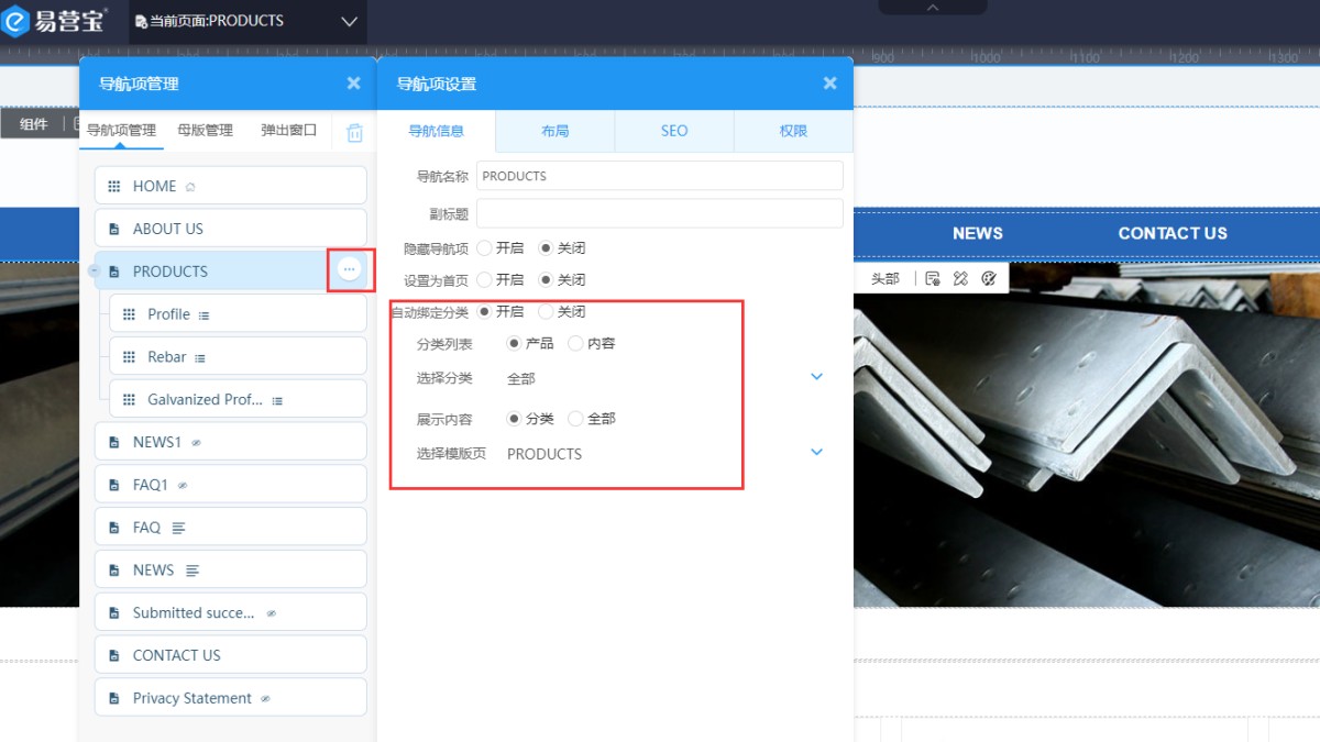 2,在导航项管理里-产品中心页面的导航设置界面,需要开启绑定分类。