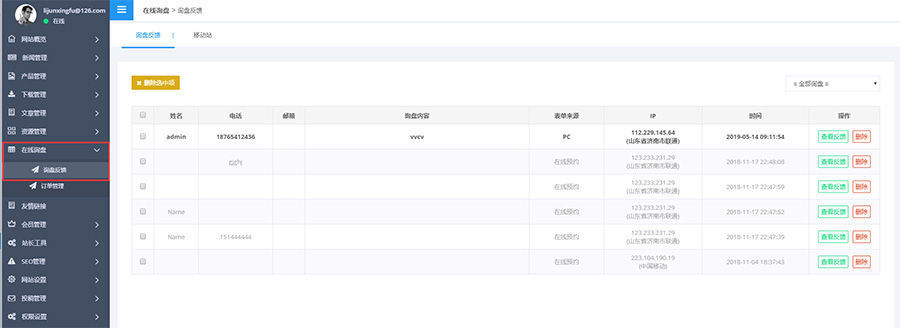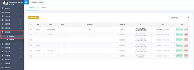 9,表单控件可以很好的了解到客户的需求,由此产生交易,询盘信息列表可在后台在线询盘中查看,可以在推送人的邮箱和微信里查看