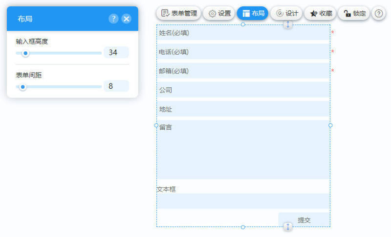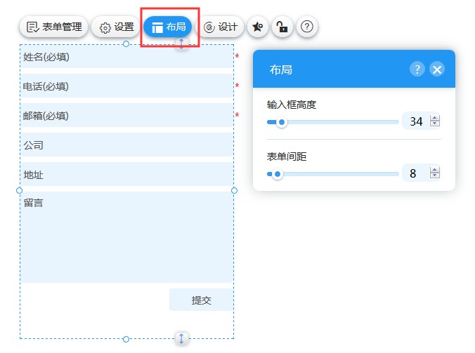 7,在“布局”里,我们可以设置文本输入框的高度和表单间距。
