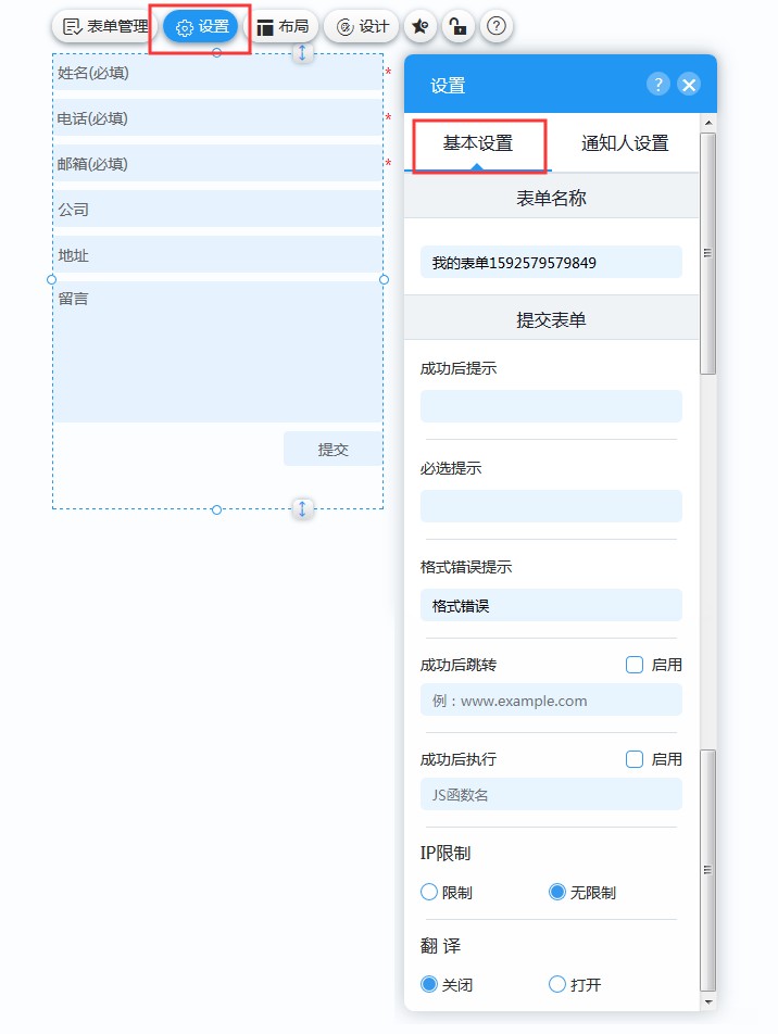 5,在“设置-基本设置”里,我们可以更改表单名称,便于我们在后台询盘列表中看到是属于哪个表单下的询盘;可以修改提交表单相关的一些信息,包括表单提交成功后的提示信息,必选项提示,格式错误提示,邮件通知——该项需要填写绑定的邮箱地址,邮箱绑定后也可实时收到询盘推送信息,该功能可多邮箱绑定邮箱之间用英文状态 逗号 隔开;可以设置表单提交成功后跳转链接;可以设置提交成功后执行操作,该功能需要填写js函数代码,对js的要求相对较高,如不确定请慎填;可以设置ip限制;还可以设置留言翻译功能,即访客在线留言时如果使用的是其他语种,后台可以直接翻译成中文,方便管理员查看。