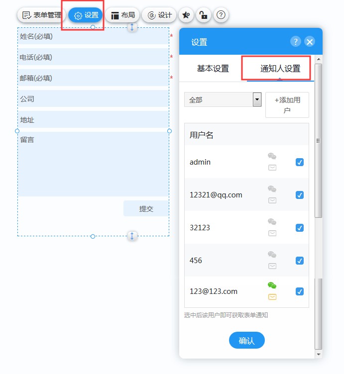 6,在“设置-通知人设置”里,可以选择接收询盘反馈的通知人。询盘推送通知的设置流程请查看:http://help.eyingbao.com/products/biaodanruhebangdingyoujiantuisongheweixintuisong.html