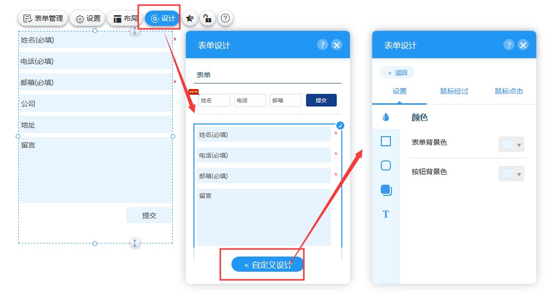 8,设计属性里,我们可以更换不同表单样式,也可以点击“自定义设计”按钮到达设计版面,对表单整体样式,鼠标经过样式和鼠标单击样式进行背景,边框,圆角,阴影,文字的设置。