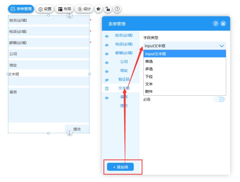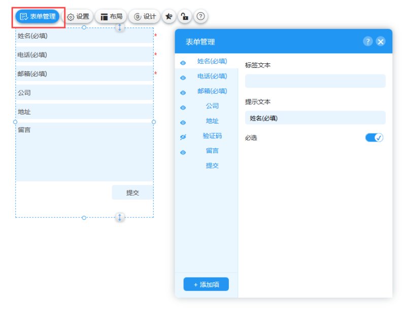 3,在“表单管理”里,可以对表单各项进行标签文本,提示文本,是否必选 进行设置。注意:默认项中的 电话,邮箱,验证码 等 都是和程序对应的,所以不可以更改为其他名称,这会在表单提交时产生不必要的错误。