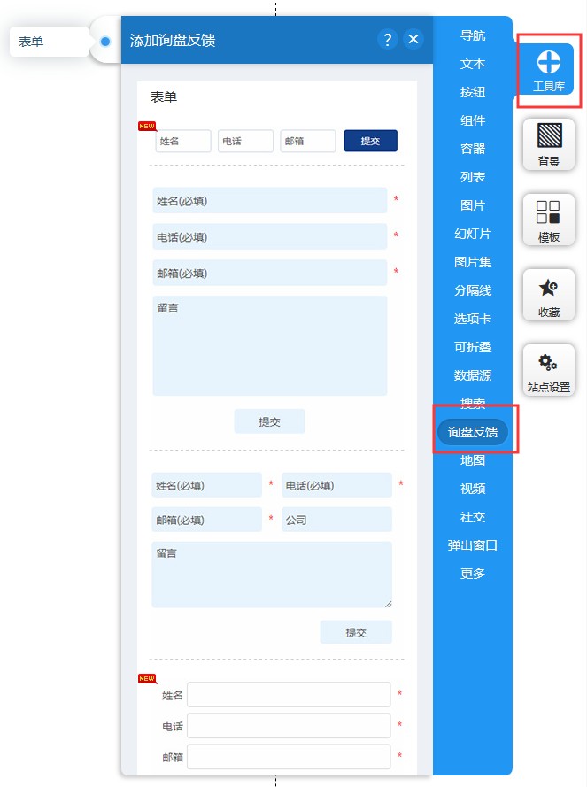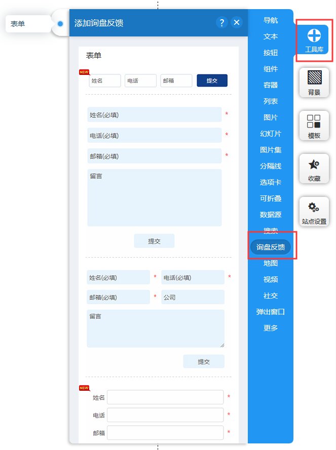 1,在工具库里点击询盘反馈控件,选择询盘反馈的样式,添加到页面上,我们目前提供4种询盘样式。