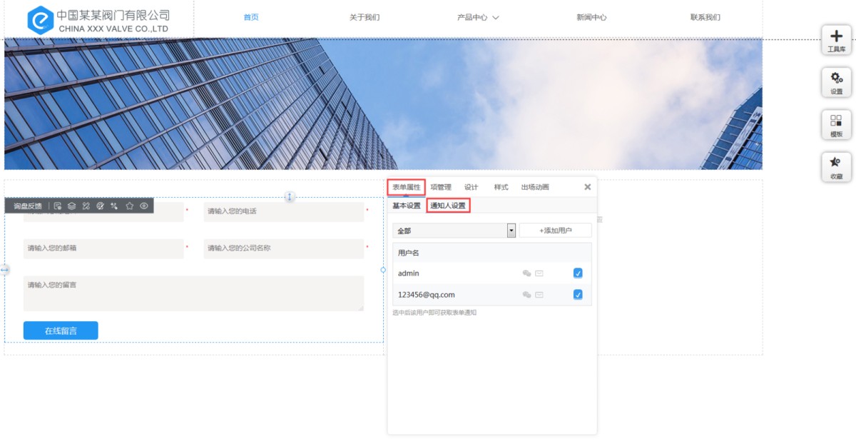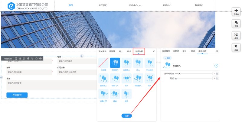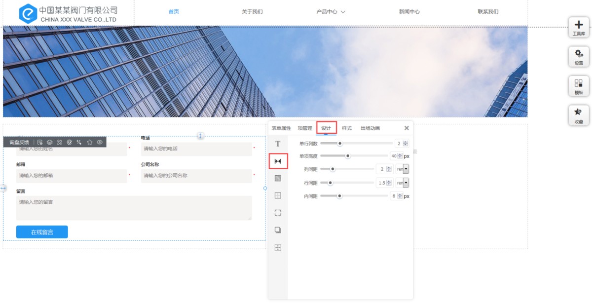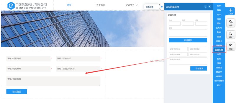 1,在工具库里点击询盘反馈控件,选择询盘反馈的样式,添加到页面上,我们目前提供3种询盘样式。