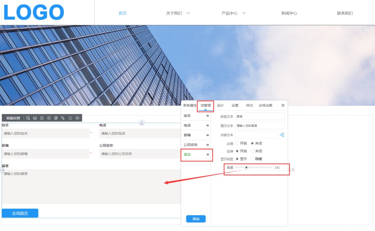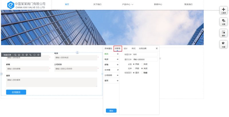 说明:系统默认的输入项包含姓名、电话、邮箱、文本框、公司名称和留言是不能删除的,也不要把默认想改成其他栏目,如果不使用,可以点击“小眼睛”图标隐藏。