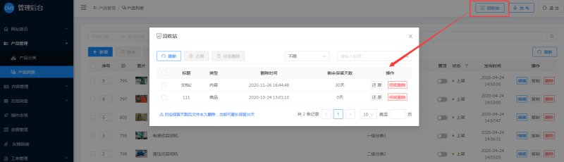3,CMS管理后台也有回收站功能。删除的产品、新闻等内容,会在回收站里保留30天。在回收站里可以操作还原或彻底删除。