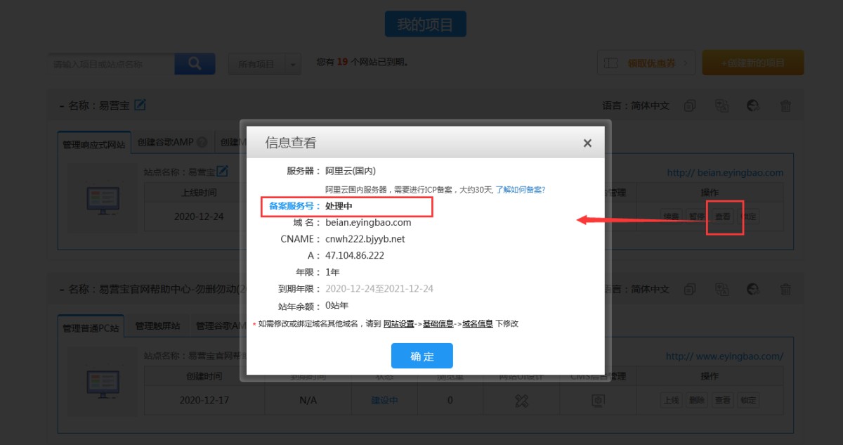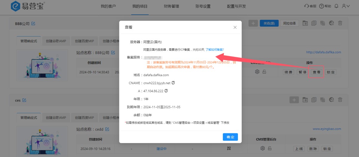 3,申请成功后,易营宝客服会在一个工作日内分配。可点击查看按钮,查看分配的备案服务号。