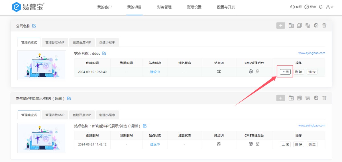 1,在“我的项目”列表里点击上线按钮,为网站开启上线。