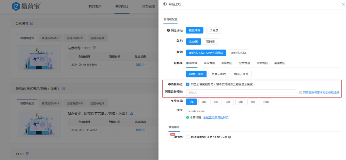2,上线时选择阿里云国内服务器,填写域名,解析,选择套餐,此处需要勾选申请备案码-阿里云备案服务号,并填写阿里云账号ID,点击开通并付费。
