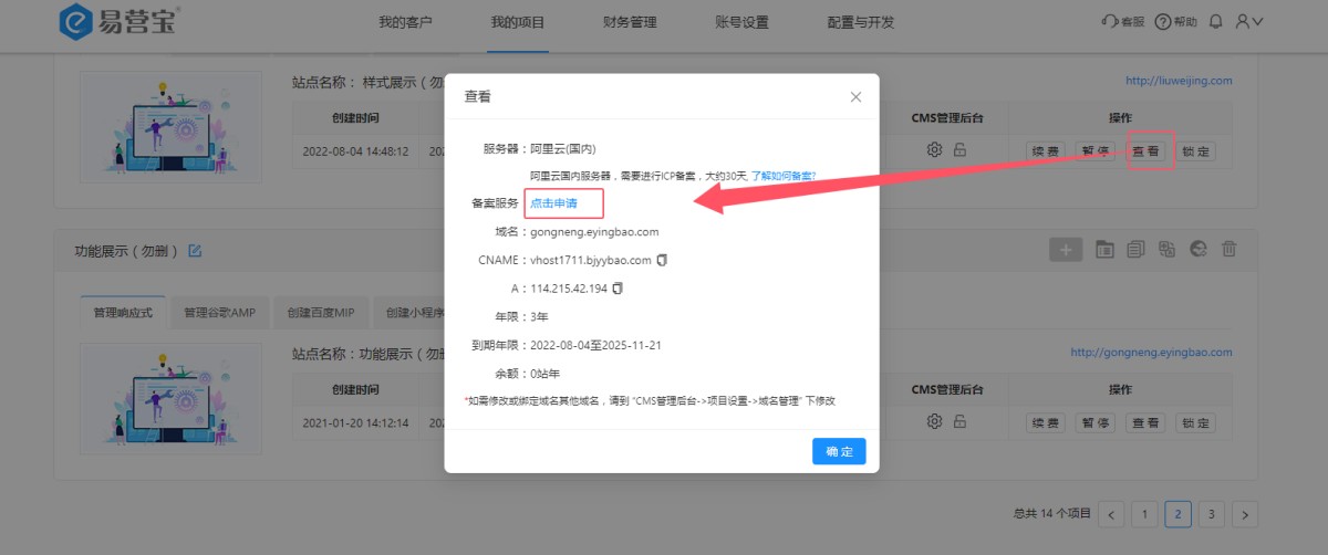 4,如果网站上线时未申请备案服务号,后期如果想要申请,可以在项目列表里点击“查看”。在站点信息里点击申请备案服务号。