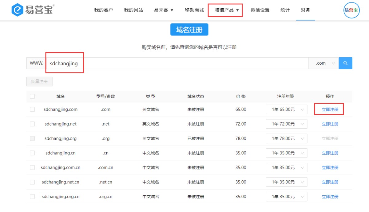 1,在增值产品-域名服务下,输入要购买的域名,查询域名是否可以注册。如果可以注册,点击“立即注册”按钮。