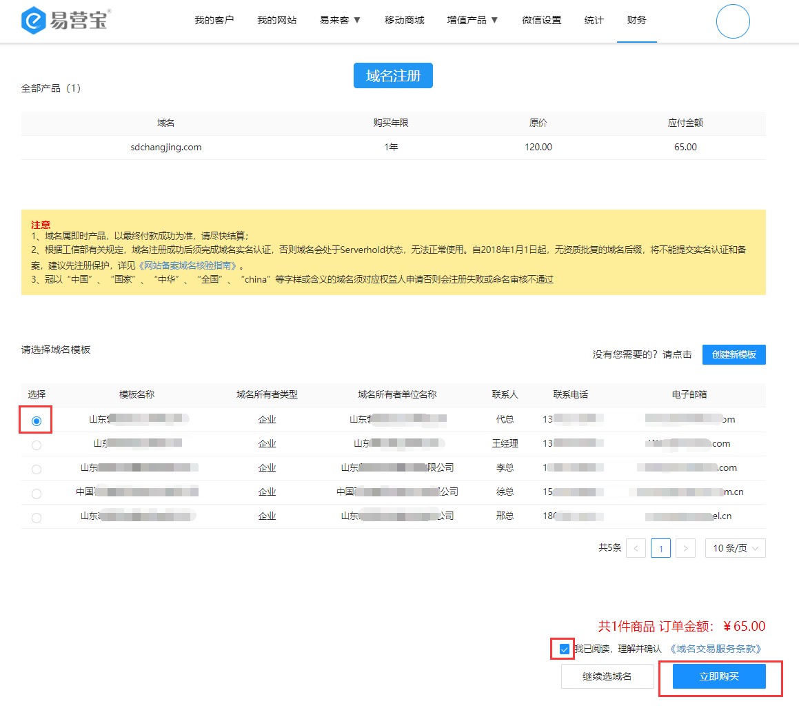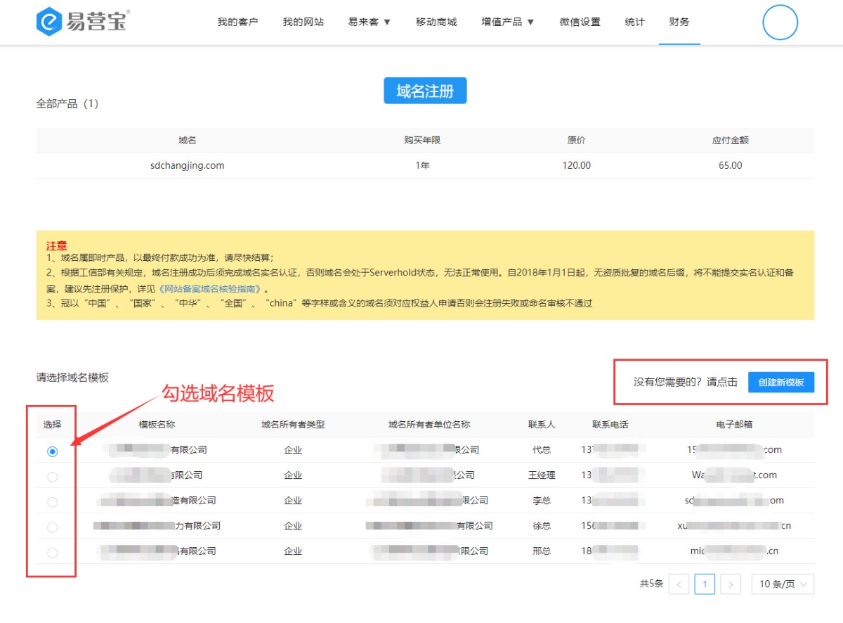 2,在注册页面,选择域名实名信息模板,然后支付即可。如果当前账号下没有该客户的模板,可以点击“创建新模板”。