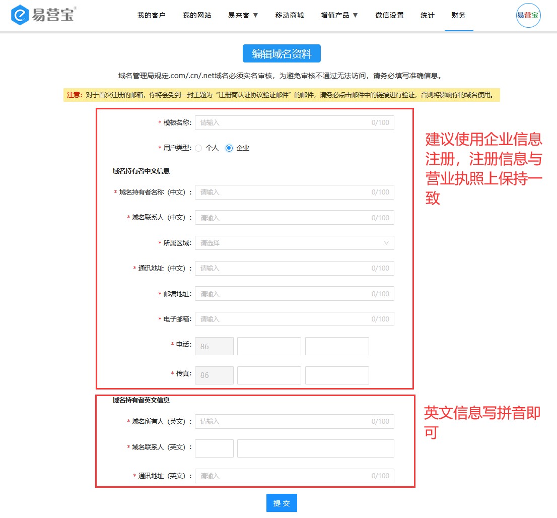 3,填写域名信息。企业注册域名时,类型选企业。域名信息与营业执照信息保持一致。英文信息写拼音即可。点击提交。