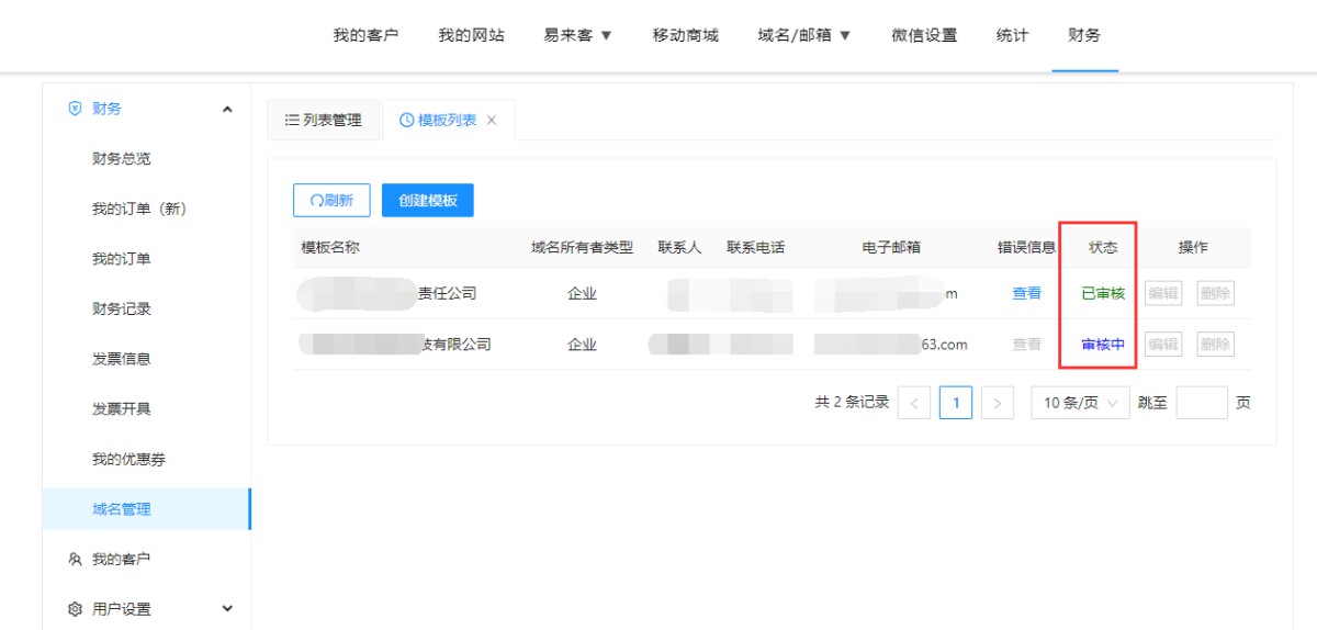 5,模板创建后需要等待新网审核,一般是1个工作日。可在财务-域名管理-模板管理里查看状态。