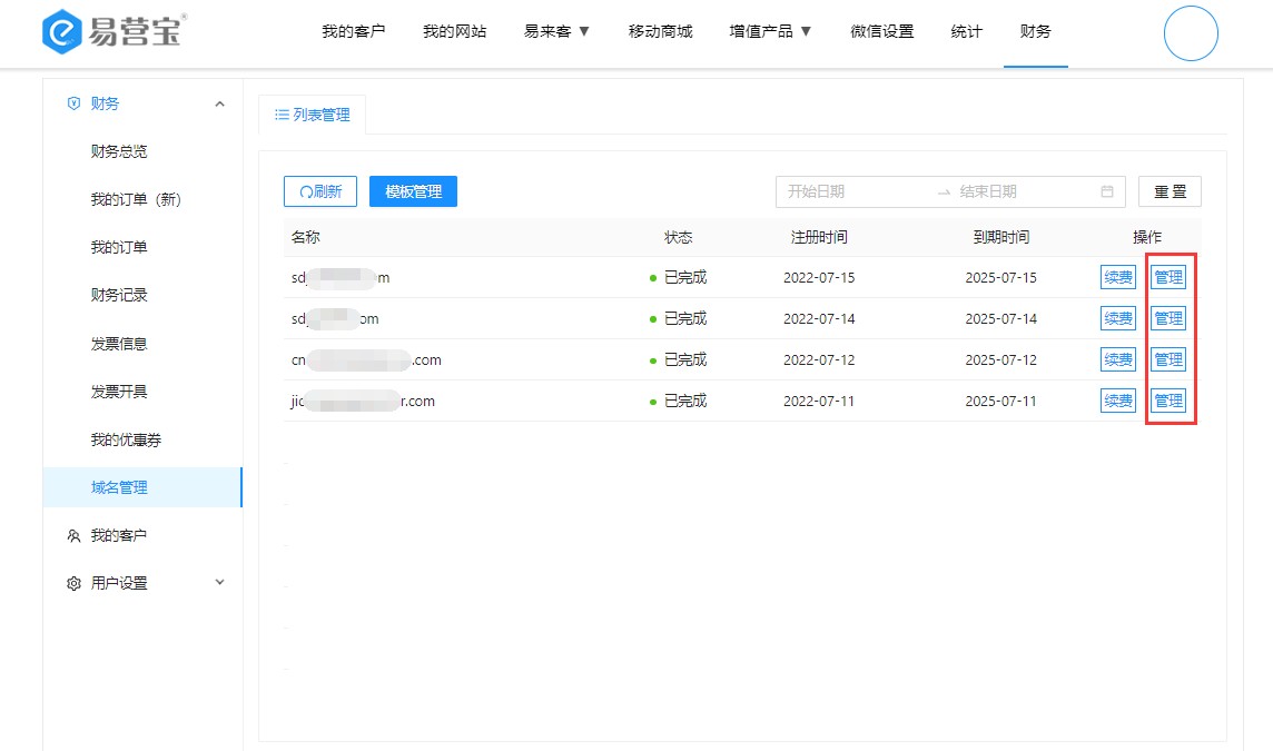 8,支付完成后,可在财务-域名管理里显示已购买的域名,点击“管理”,可查看域名管理后台的登录地址和账号密码。