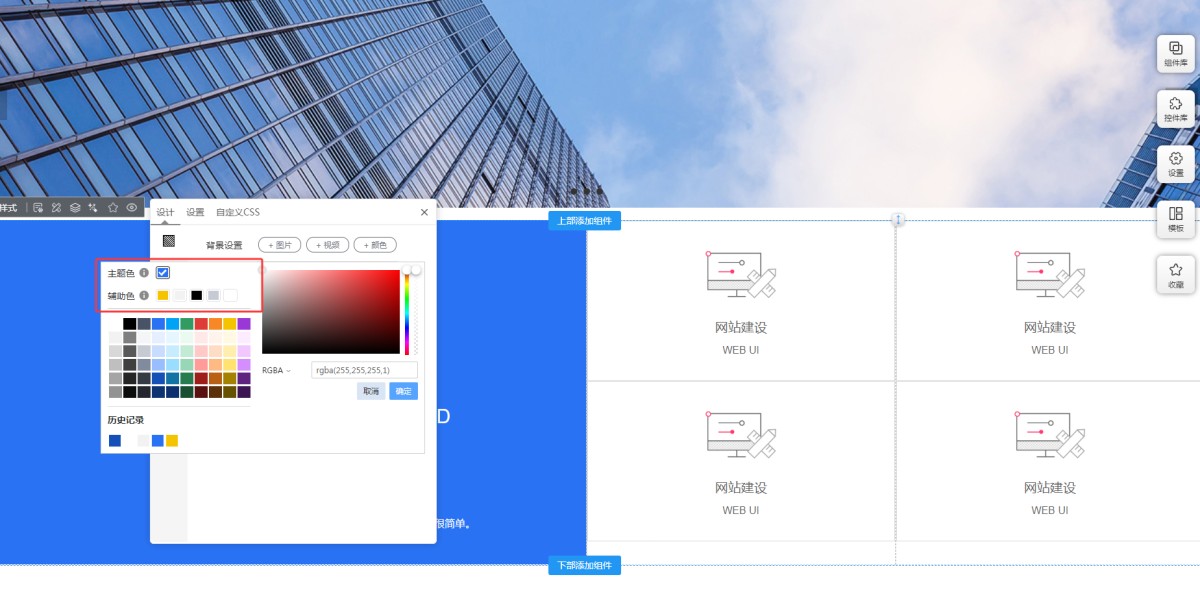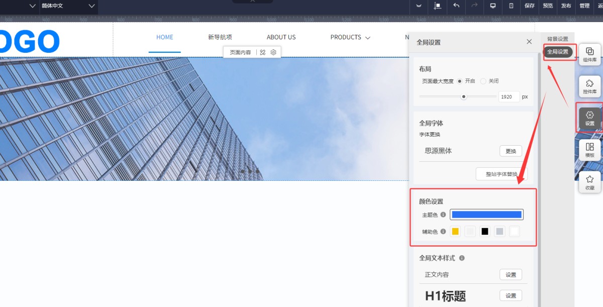 4,后期如果需要调整网站色调,只需在全局设置中修改主题色和辅助色,所有相关控件和组件的颜色将自动同步更新。