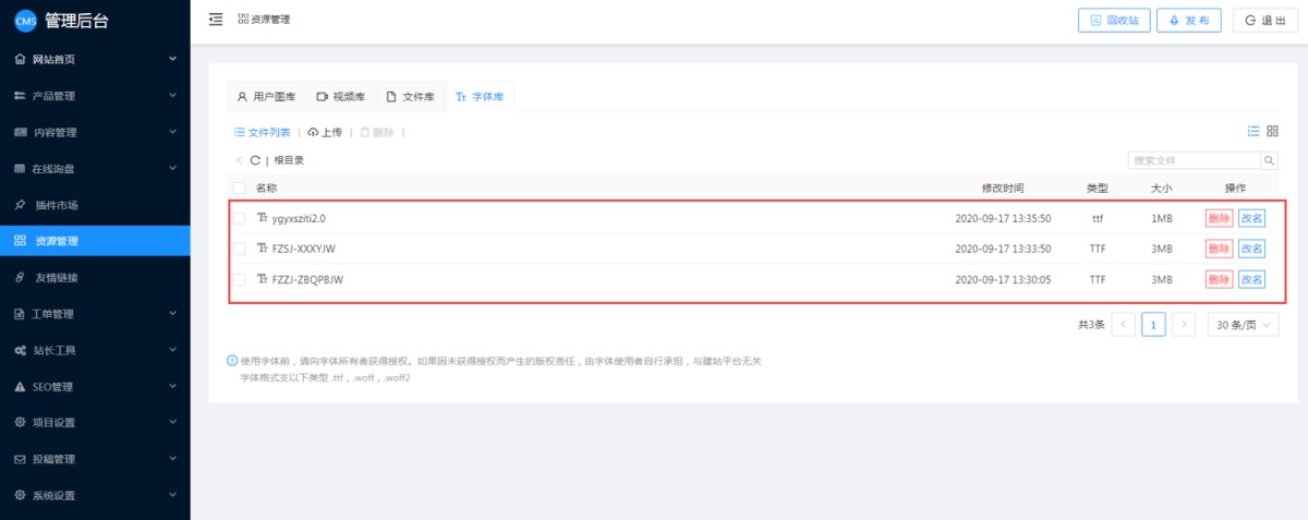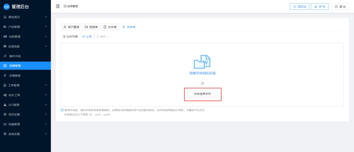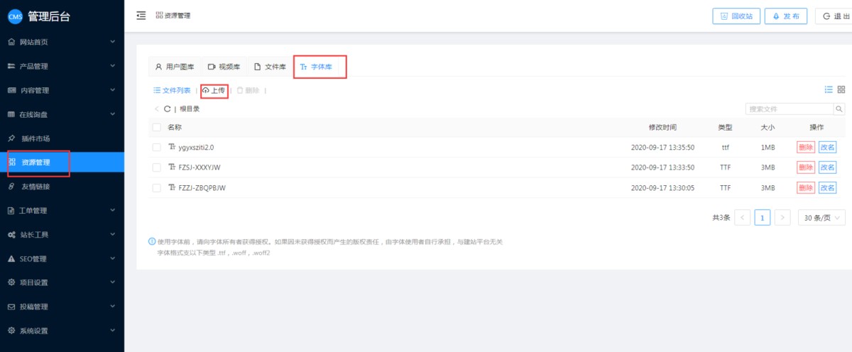 1,在网站CMS管理后台-资源管理-字体库里,点击上传。