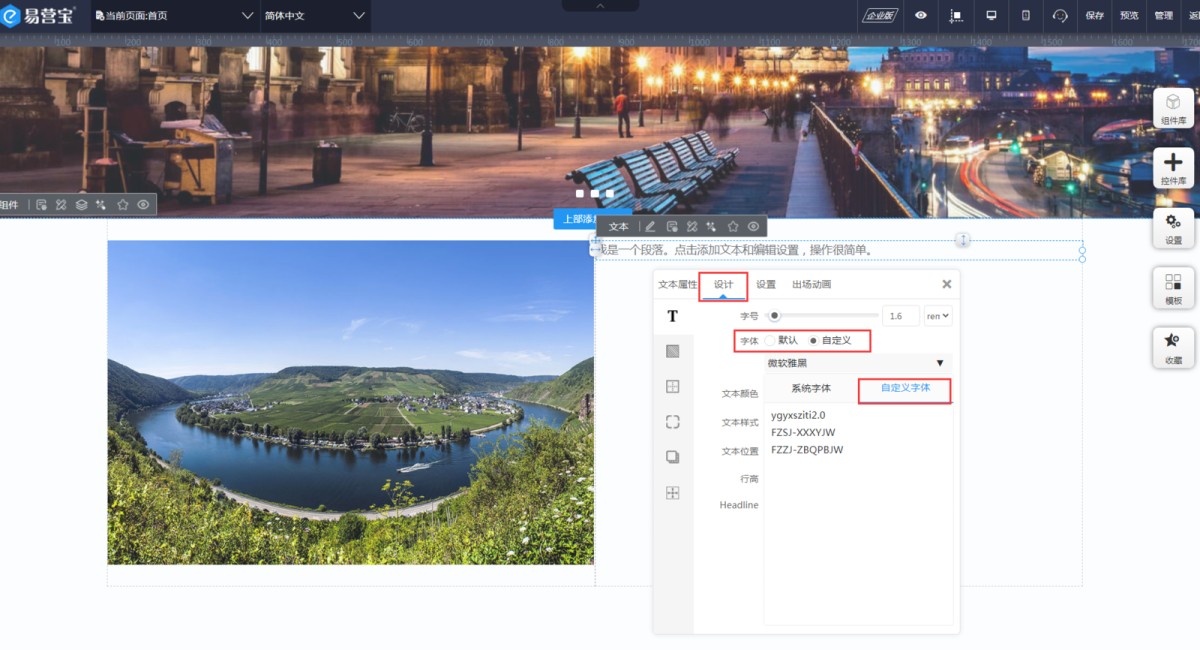 4,后台字体上传完成后,在网站编辑页面,字体属性里,有个自定义字体,就会显示你自己上传的字体,选择使用即可。