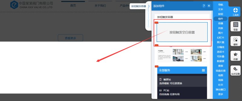 按钮触发容器在组件控件里,属于组件的一种。按钮触发容器有三种样式,实现的效果是,页面上默认只显示一个按钮,点击按钮时会展开一个弹出层容器。下面我们用按钮触发空白容器演示。