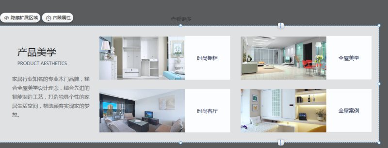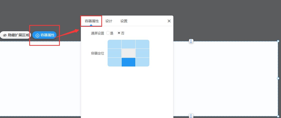 2,在“容器属性”里,可以设置容器是否为通屏和容器在按钮的哪个方位展开。