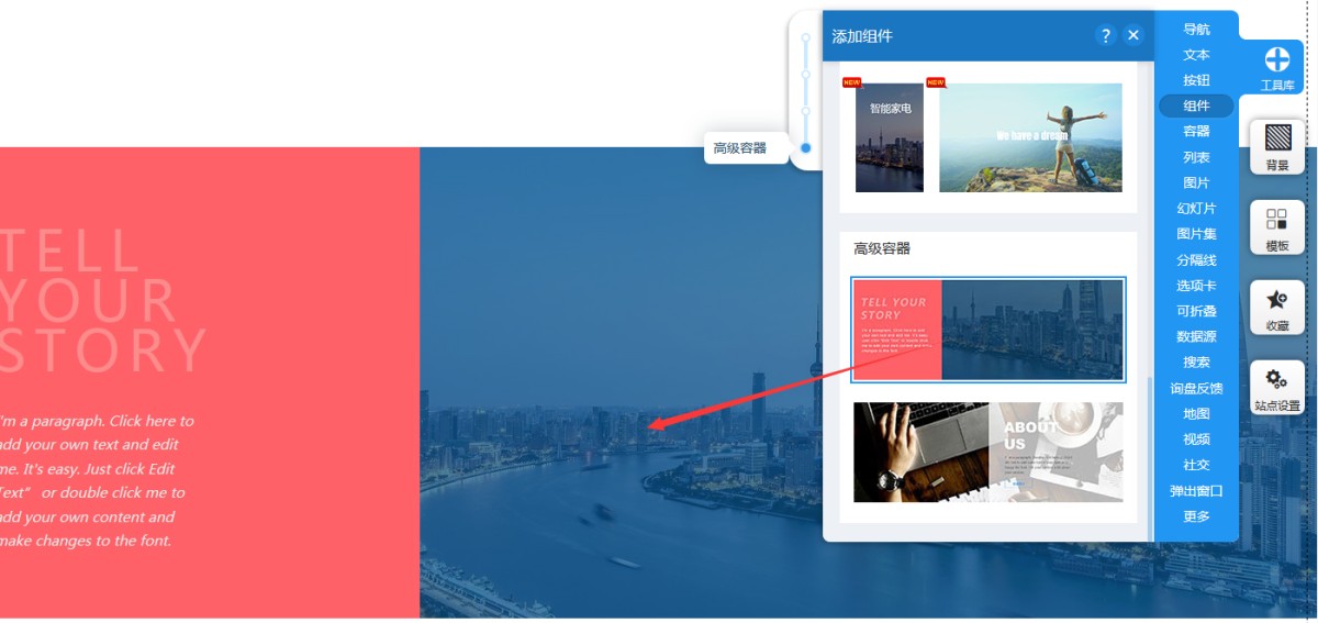 1,从工具库-组件里,选择高级容器,添加到页面指定位置上。