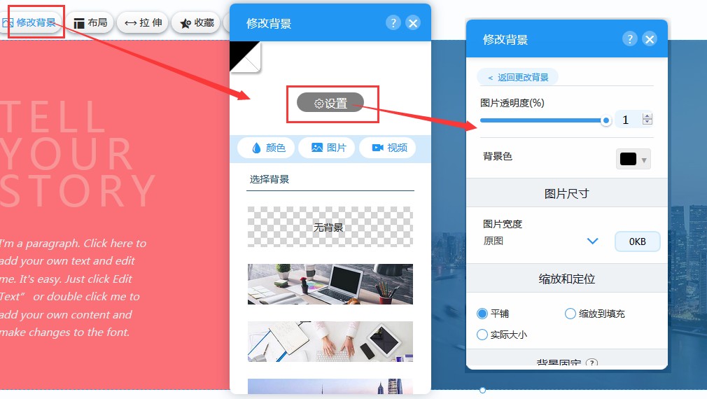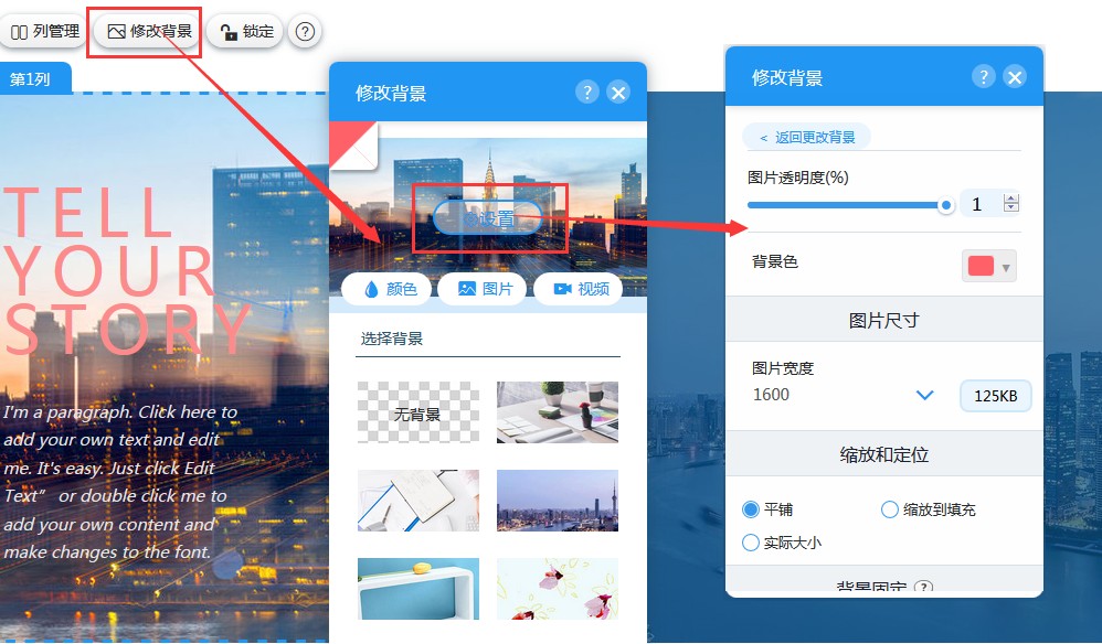 2,在“修改背景”里,可以设置整个容器的背景色或背景图,如果设置的是背景图,可以在设置里修改图片的透明度、背景色、图片宽度、缩放和定位、背景固定和背景定位等。