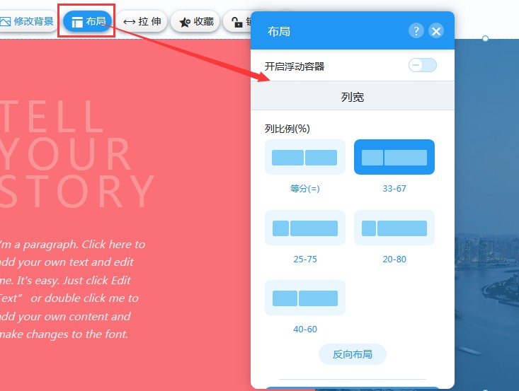 3,在“布局”里,可以设置开启浮动容器、设置列宽和列间距。