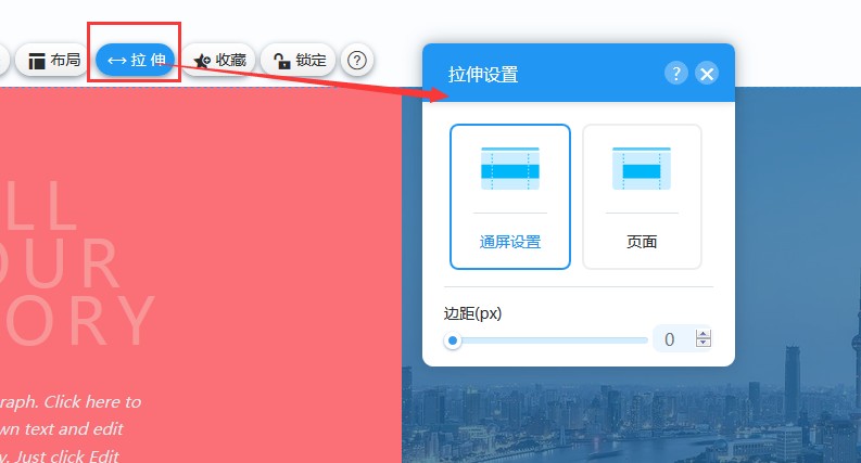 4,在“拉伸”里,可以容器是通屏还是按照当前宽度显示。