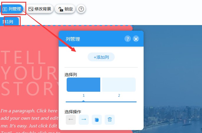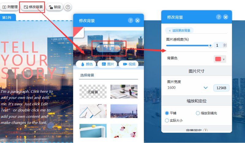 7,在列属性里,点击“修改背景”,可以给这一列设置背景颜色或背景图片,如果设置的是背景图,可以在设置里修改图片的透明度、背景色、图片宽度、缩放和定位、背景固定和背景定位等。