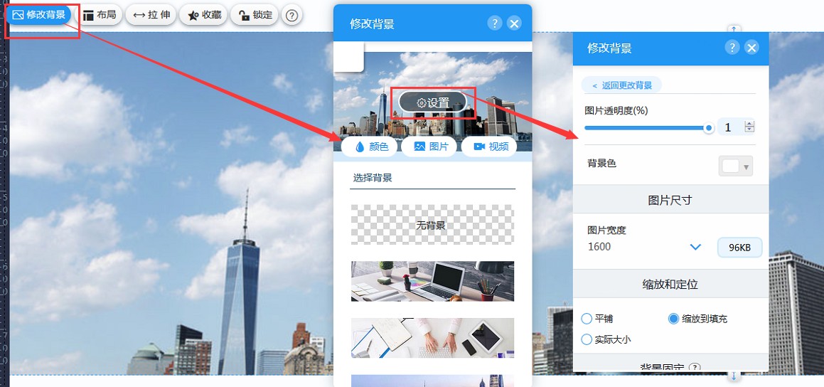 2,点击容器,页面上会显示容器的属性。在“修改背景”里,可以设置容器的背景颜色或背景图(视频背景暂未上线)。如果设置的是背景图片,点击图片上的设置,会进入图片属性面板,可以设置图片的透明度和背景色,如果想给图片加蒙层效果,可以把图片的透明度调小,并设置背景颜色,这样是蒙层的效果;还可以设置图片的尺寸、缩放与定位、背景是否固定以及背景的定位。