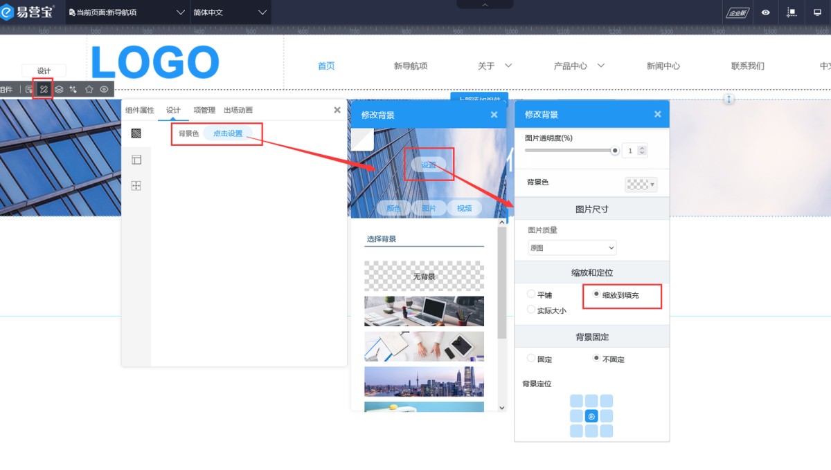 1,在组件属性-设计-背景色设置-图片设置里,有个缩放和定位,建议选择缩放到填充。